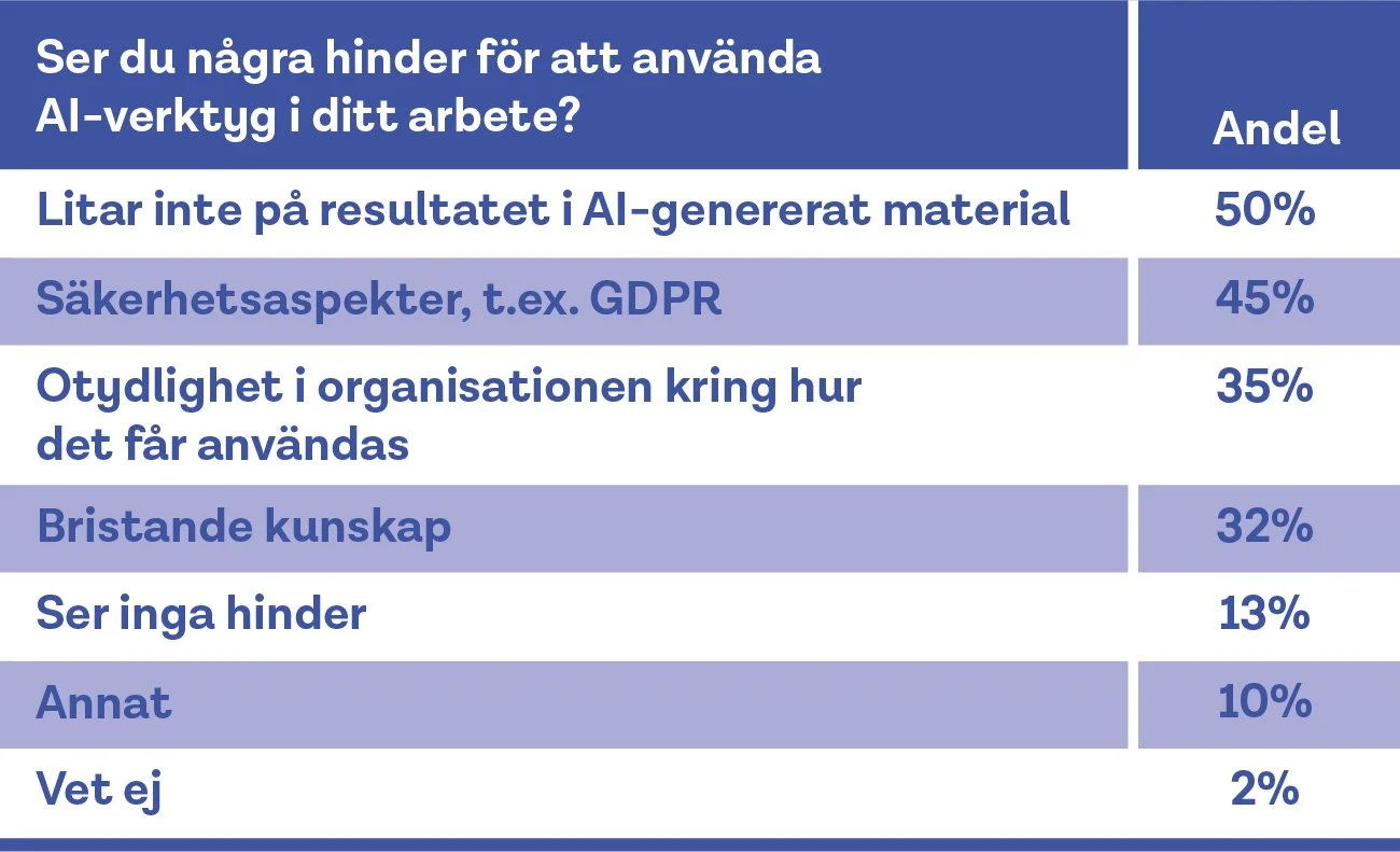 Allt fler som arbetar med kommunikation har redan gjort AI till en del av sin vardag. Enligt en rapport från fackförbundet DIK använder över nio av tio kommunikatörer AI i arbetet redan idag. Samtidigt anser många att AI-verktygen än så länge håller för låg kvalitet, och att det krävs mycket handpåläggning och granskning för att få ut ett bra resultat.