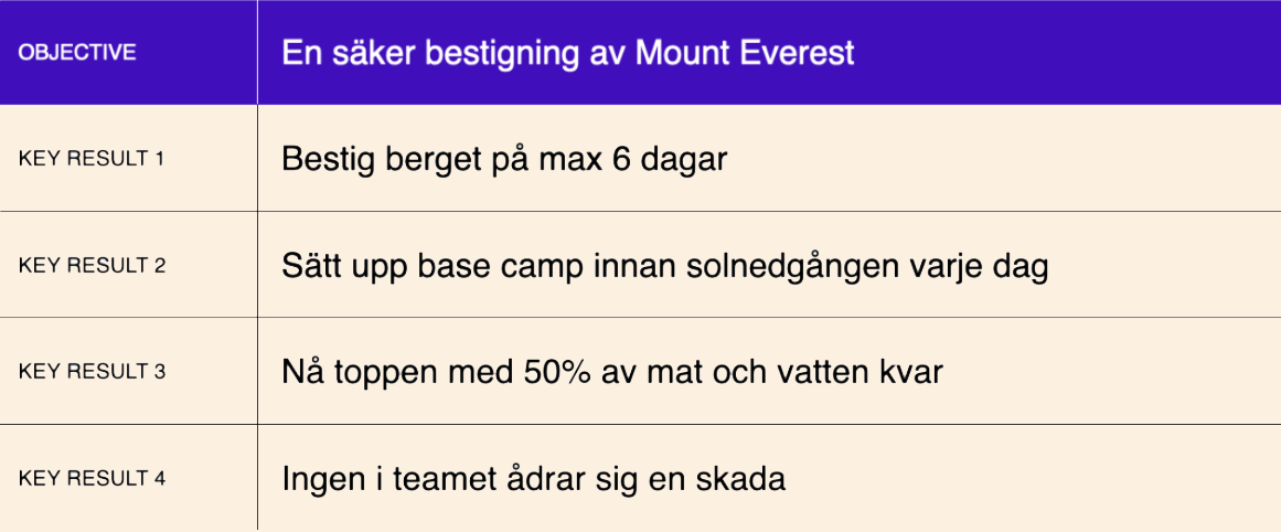 Varje Objective bör ha 2-5 Key Results. De ska vara utmanande men inte omöjliga.